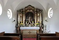Der hölzerne Altar aus der Mitte des 18. Jahrhunderts ist marmoriert mit vergoldetem und versilbertem Dekor und einer Kastenstipes. Die Predella weist fünf verschieden große, geschweifte Öffnungen auf. Die tabernakelartige mittlere Öffnung, die durch ein Halbkreisgesims überhöht ist, enthält eine Statuette des gegeißelten Heilands. Den breiten konkaven dreiachsigen Aufbau tragen vier korinthische Säulen. In der breiteren Mittelachse ist ein geschweiftes Gemälde der Pietà zu sehen. Davor stehen auf einem Predellagesims Statuetten der heiligen Veronika und von Dismas, dem guten Schächer. Der Auszug ist niedrig und mit Voluten geschmückt. Das Holzgitter vor dem Altar dürfte um 1800 geschaffen worden sein.