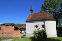 Das Gebäude mit einem hohen Sockel an der Westseite steht am südlichen Ortsende an der Westseite der Bundesstraße auf einem gegen Westen abfallenden Gelände. Der halbrund geschlossene Bau besitzt drei Achsen mit Kreuzgratgewölben ohne Gurte. Im Chorschluss befindet sich eine Kalotte. In den beiden östlichen Achsen sind Querovalfenster in die Wände eingelassen. In den nördlichen befindet sich eine doppelte Rechtecktür aus dem 18. Jahrhundert mit einem Achteckmuster und einer Mittelrosette. Das Traufgesims und die Giebelschrägen sind profiliert. Ein hölzerner quadratischer Dachreiter hat eingezogene, rundbogige Schallöffnungen. Das Zeltdach ist mit Blech gedeckt. Außen befindet sich im Chorscheitel eine kleine eingezogene rundbogige Figurennische mit einem profilierten Sohlbankgesims.