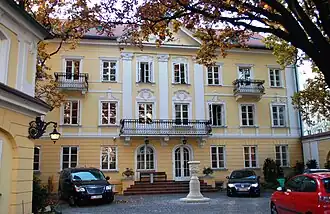 ![]() Die Fassade des dreigeschossigen Palastes mit großem Balkon im ersten Stock, Pilastern und Giebeldreieck | ||