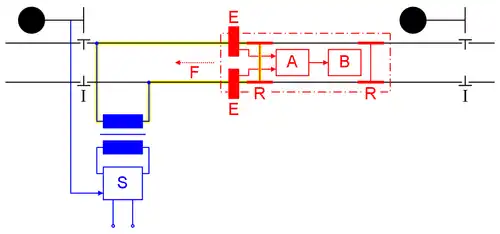 Blau: Speiseseite des Gleisstromkreises mit Codiereinrichtung (S) des Schienenlinienleiters mit Ansteuerung vom zugeordneten Signal