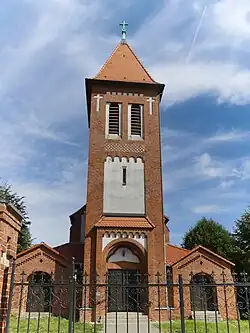 Im Süden schließt sich der stark eingezogene, quadratische Kirchturm an. Westlich und östlich wird er von je einem Anbau mit einer rundbogenförmigen Pforte im Süden flankiert. Sie umrahmen das große, rechteckige Mittelportal, das von einem gemauerten Rundbogen eingefasst wird. Darüber erhebt sich das mittlere Geschoss. Die Mauersteine formen dabei eine rechteckige Blende, die an ihrer oberen Seite von einem nach unten geöffneten Fries verziert wird. Mittig sitzt je ein hochrechteckiges, schlitzförmiges Fenster. Darüber erhebt sich das Glockengeschoss. In den seitlichen Lisenen gibt es je eine kreuzförmige Blende, dazwischen zwei hochrechteckige Klangarkaden. Der Turm schließt mit einem Pyramidendach mit Kreuz ab.