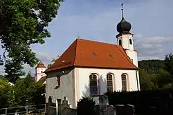 Die Saalkirche wurde 1737/38 erbaut. Ihr Langhaus hat nach Süden einen dreiseitig geschlossenen Chor, an dessen mittlerer Wand der Kirchturm auf quadratischem Grundriss angebaut ist. Sein oberstes achteckiges Geschoss beherbergt den Glockenstuhl. Darauf sitzt eine Zwiebelhaube.