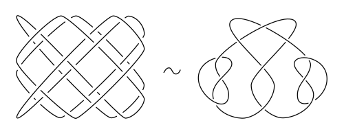 Nicht-alternierenden Knotendiagrammen kann man nicht ansehen, ob sie prime oder zusammengesetzte Knoten darstellen: hier gezeigt ist die Projektion auf die x-y-Ebene eines Lissajous-Knotens (gegeben durch ) (links) und die Darstellung als alternierendes reduziertes Knotendiagramm (Summe aus drei Primknoten, rechts)