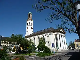 Die Zwölf-Apostel-Kirche hat den höchsten Kirchturm der Stadt. Details wie der auf der Eingangsseite vorangestellte Portikus erinnern an Weinbrenners 1816 eingeweihte Evangelische Stadtkirche Karlsruhe.
