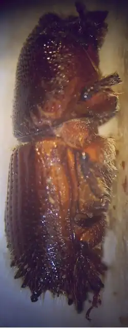 Die Käfer werden 5,5 bis 8,2 Millimeter lang und haben einen braun gefärbten, walzenförmigen Körper. Der Halsschild verdeckt von oben gesehen den Kopf. Die Flügeldecken haben einen schrägen Absturz, welcher eine flache Mulde bildet. Der Absturzrand ist mit Zähnchen besetzt. Dabei folgt auf drei kegelförmige Zähnchen das vierte, größte, welches am Ende knopfförmig verbreitert ist. Zwei weitere Kegelzähnchen folgen diesem, bis der Flügeldeckenrand den Absturz abschließt. Die Fühlergeißel ist fünfgliedrig. Das männliche Tier weist kräftigere Zähne am Flügeldeckenabsturz und einen stärkeren Stirnhöcker auf, zudem trägt das siebente Sternit in der Mitte kürzere Haare als das des weiblichen Tiers.