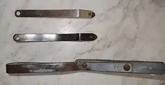 „Gesägte“ Heftklammern aus Stahl für Drucklufttacker weisen in den Enden abgeschrägte Spitzen auf. Im Kürschnerhandwerk gebräuchlich sind Klammern mit einer Breite von 7 mm und einer Höhe von 12 mm.