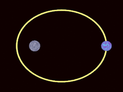 Zwei Körper, die sich gegenseitig umkreisen, senden Gravitationsstrahlung aus, wodurch die Bahnen der Objekte allmählich an Energie verlieren.