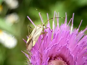 Die Wanze lebt in Wiesen und anderen offenen (unbewaldeten) Habitaten. Sie ist in vielen Regionen die häufigste Wanzenart in Getreidefeldern.[4] Als Nahrungs- und Eiablagepflanze bevorzugt sie Korbblütler (Asteraceae)[5], wo das Weibchen die Eier mit seinem Legebohrer (Ovipositor) in das Gewebe des Stängels einsenkt[6]. Sie wird aber von einer Vielzahl unterschiedlicher Nahrungspflanzen gemeldet, darunter auch Holzgewächse und Gräser. Häufig wird sie auch von Brennnesseln angegeben. Die Art saugt gern an Blüten und Fruchtanlagen.