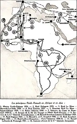 Am 24. des Monats (mit nur einem Ruhetag in Adrar) kamen die Fahrzeuge nach nur zehn Tagen in Bourem an. Der Konvoi überquerte dann den 700 Kilometer entfernten Niger bei Gaya, um Cotonou zu erreichen. Die Mechaniker-Fahrer hießen Liaume, Liocourt und Bonnaure. Jeder Wagen wurde von vier bewaffneten Legionären begleitet, die auch die Fahrzeuge fahren konnten. Das Hauptziel war erreicht, die Mission endete am 11. Dezember 1924 in den französischen Kolonien in Zentralafrika, 200 Kilometer südlich von Gao im Sudan.[1][2] Die Vorgängermission von 1923 wurde mit Fahrzeugen vom Typ Citroën-Kégresse Halbkettenfahrzeuge K1 Sahara durchgeführt. Auch bei dieser Mission war Gaston Gradis der Initiator, der sogar eigens eine Compagnie générale transsaharienne (CGT) gegründet hatte. Anhand der Karte kann man die vielen Folgeexpeditionen entnehmen, die zumeist in Nord-Süd-Richtung verliefen. Aber auch West-Ost-Fahrten wurden gestartet, wie zum Beispiel die Mission Tranin-Duverne.