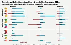Indikative Verknüpfungen zwischen Klimaschutzmaßnahmen und SDGs (Abbildung SPM.8)C.9: „Klimaschutzmaßnahmen können – unabhängig vom wirtschaftlichen Sektor, in dem sie umgesetzt werden – zur Erreichung der Ziele für nachhaltige Entwicklung (SDGs) beitragen. Positive Nebeneffekte überwiegen vor allem bei Maßnahmen zur Reduktion des Energieverbrauchs und bei Maßnahmen, die Land- und Forstwirtschaft betreffen.“ (Abbildung SPM.8)