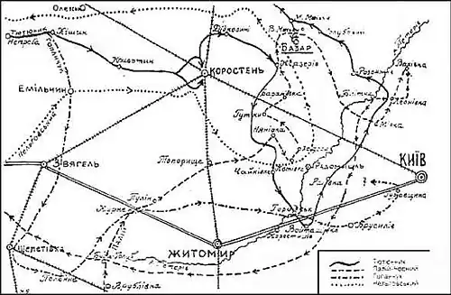 Verlauf des Feldzuges der Wolhyniengruppe. In dem rautenförmigen Bereich liegt Kiew im Osten und Korosten im Norden. Das Dorf Basar liegt nordöstlich von Korosten
