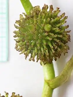 Die Fruchtköpfchen haben einen Durchmesser von 8 bis 15 Millimetern. Die hell-braune Frucht ist bei einer Länge von 3,5 bis 6 Millimetern sowie bei einem Durchmesser von 1,5 bis 2 Millimetern spindelförmig und hat einen kurzen, bis 0,5 Millimeter langen schnabelartigen Griffel.[2]