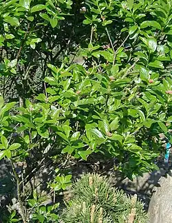 Die wechselständig an den Zweigen angeordneten Laubblätter sind Blattstiel und Blattspreite gegliedert. Der Blattstiel ist 5 bis 10 Millimeter lang. Die einfache, ledrige Blattspreite ist bei einer Länge von 3 bis 7 Zentimetern länglich-eiförmig bis elliptisch mit breit-keilförmiger bis abgerundeter Spreitenbasis. Es sind sechs bis neun Nervenpaare vorhanden. Die Blattoberseite ist kahl und glänzend, die Blattunterseite mehr oder weniger blaugrün, kahl bis etwas weißfilzig. Der Blattrand ist gleichmäßig gezähnt. Die Nebenblätter werden früh abgeworfen.[4][5]