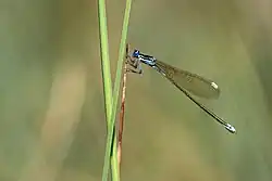 Die Imagines sind von zierlicher Gestalt und erreichen eine Flügelspannweite von 25 Millimetern. Die Männchen sind am seitlichen Thorax hellblau gefärbt und oberseitig metallisch-grün. Das Hinterleibsende ist ab der Mitte des 8. Abdominalsegments blau gefärbt. Die Weibchen treten in einer grünen, blauen oder einer orangen Farbmorphe auf und fallen durch ihren etwas kräftigeren Hinterleib auf. Die Flügelmale sind weiß, ockerfarben oder hellbraun. Die Flügel sind relativ kurz; an den Körper angelegt reichen sie nur bis zum sechsten Hinterleibssegment. Insgesamt ist diese Libellenart durch ihre geringe Größe kaum verwechselbar; gewisse Ähnlichkeiten bestehen mit der Kleinen Pechlibelle (Ischnura pumilio).