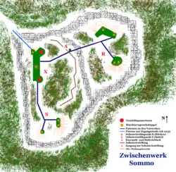 - 1 × Panzerkuppel mit zwei Maschinengewehren auf dem Kasemattblock