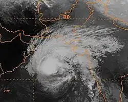 Der tropische Zyklon 03A erzeugte eine starke Sturmflut, deren Höhe rund 4,9 m erreichte und Salzgärten sowie Orte an der Küste verwüstete.[23] Nach Schätzungen wurden rund 10.000 Bewohner der Region durch den Sturm getötet,[24] viele davon waren Arbeiter in den Salzgärten, die kein Radio besaßen und deswegen wenig oder gar nicht vor dem Zyklon gewarnt wurden. Teilweise wurde der hohe Verlust an Menschenleben Unternehmern zugeschrieben, die keinen Gewinn einbüßen wollten und deswegen ihre Arbeiter nicht vor dem sich nähernden Zyklon warnten.[23] Außerdem war die Region seit 1890 lediglich von 17 Zyklonen getroffen worden, von denen alle schwächer waren als Zyklon 03A. Deswegen schätzte man die Gefährdung der Region sowohl durch die Bevölkerung als auch die Katastrophenschutzbehörden falsch eingeschätzt.[25] Der starke Wind verursachte eine Unterbrechung der Stromversorgung für viele Ortschaften in der Region.[26] Ein Sendemast in Porbandar stürzte ein und führte so zu Störung der Telekommunikationsverbindungen.[27] Der Kraft des Sturmes hielten hunderte von Masten der Elektrizitätsleitungen nicht stand; der Schaden dadurch wurde auf 10 Milliarden Rupien geschätzt.[28] Mindestens 893 Personen wurden durch den Sturm verletzt und mehr als 11.000 landwirtschaftliche Nutztiere wurden getötet. Mehr als 162.000 Bauwerke wurden beschädigt oder zerstört. Der Sachschaden in der betroffenen Region wurde auf 120 Milliarden Rupien errechnet.[29] Die Reste des Sturmsystems erzeugten schwere Regenfälle über Pakistan, wo deswegen 12 Personen durch Stromschlag starben.[23]