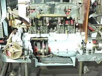 - eine Schränkung der Zylinderbänke. Dabei werden die beiden Zylinderbänke im unteren Bereich geringfügig nach außen versetzt. Dadurch schneiden sich die beiden Ebenen, die durch die Zylinderlängsachsen der jeweiligen Bank gebildet werden, nicht wie üblich in der Kurbelwellenlängsachse,[8][33] sondern darunter, was die Materialbelastung erhöht.