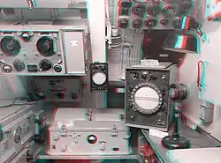 Anaglyphen­bild des Funkraums von U 995. (Stereo­skopische Ansicht mit­hilfe einer Rot-Cyan-Brille möglich.)