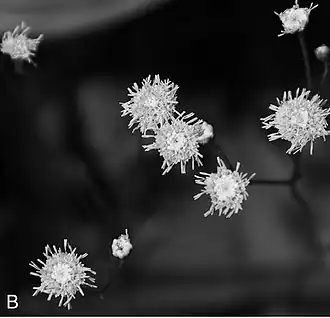 Jedes Blütenkörbchen enthält 20 bis 23 Röhrenblüten. Die weißen, meist kahlen Röhrenblüten sind 2,2 bis 2,3 Millimeter lang und gelappt. Die dick gerippte Kronröhre ist an ihrer Basis breiter als im oberen Bereich, an dem sie dem Griffel eng anliegt. Die dreieckig geformten Kronlappen sind spärlich drüsig punktiert. Die Theken Staubbeutel sind etwa 0,5 Millimeter lang. Der Pollen befindet sich in einer Flüssigkeit und ist rund 18 Mikrometer groß. Der Griffel ist und seiner Basis dicht papillös oder behaart und besitzt verdickte Anhängsel.[1]