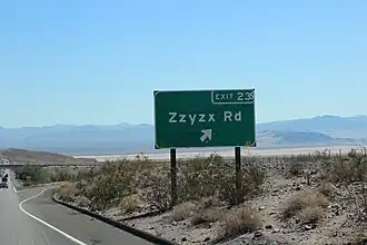 Zzyzx [] ist ein gemeindefreies Gebiet im San Bernardino County, Kalifornien und der Sitz des Wüstenforschungszentrums der California State University.[1] Angeschlossen ist ein hydrologisches Institut mit dem Namen Zzyzx Spring. Die Namen wurden 1984 durch das United States Board on Geographic Names bestätigt und stellen unter allen bestätigten Ortsnamen Amerikas den letzten im Alphabet dar.